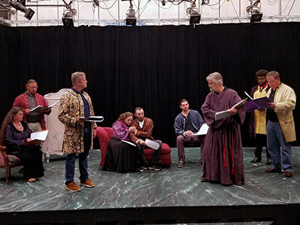 The cast of “Tartuffe” during a recent rehearsal. From left: Carol Thompson as Elmire, Chris Schmalbach as Cleante, Jim Morris as Orgon, Kyla Donnelly as Marianne, Danny Gleason as Valere, Hudson Eder as Damis, George Hartpence as Tartuffe, Darrell J. Watts as Laurent, and Rupert Hinton as The Officer.