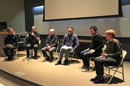 The day began with a lunchtime discussion moderated by Professor Kelly, second from left. The artists are, from left, Andrew Zimmerman, Robert Erickson, Richard Tinkler, Alex Paik and Ryan Sarah Murphy.