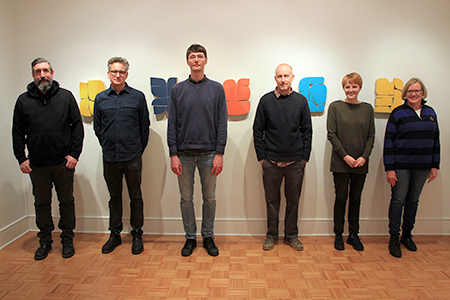 From left, Prof. Lucas Kelly, the exhibit's curator, artists Andrew Zimmerman (with his brightly colored paint on wood pieces), Richard Tinkler, Robert Erickson, Ryan Sarah Murphy and Gallery Director Alice Thompson.