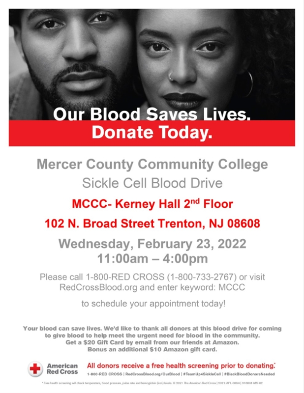 RedCrossBlood.org here and entering the keyword MCCC. You can also sign up using the American Red Cross Blood Donor app and entering the sponsor code MCCCKerney. All donors will receive a $20 Amazon Gift Card. Bring photo identification and remember to eat a meal and drink fluids before donating. Flyer here.