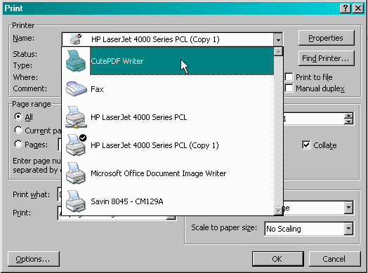 Click on the drop-down box for the Printer Name and select "CutePDF Writer.
