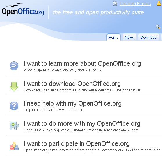 OpenOffice homepage at http://www.openoffice.org